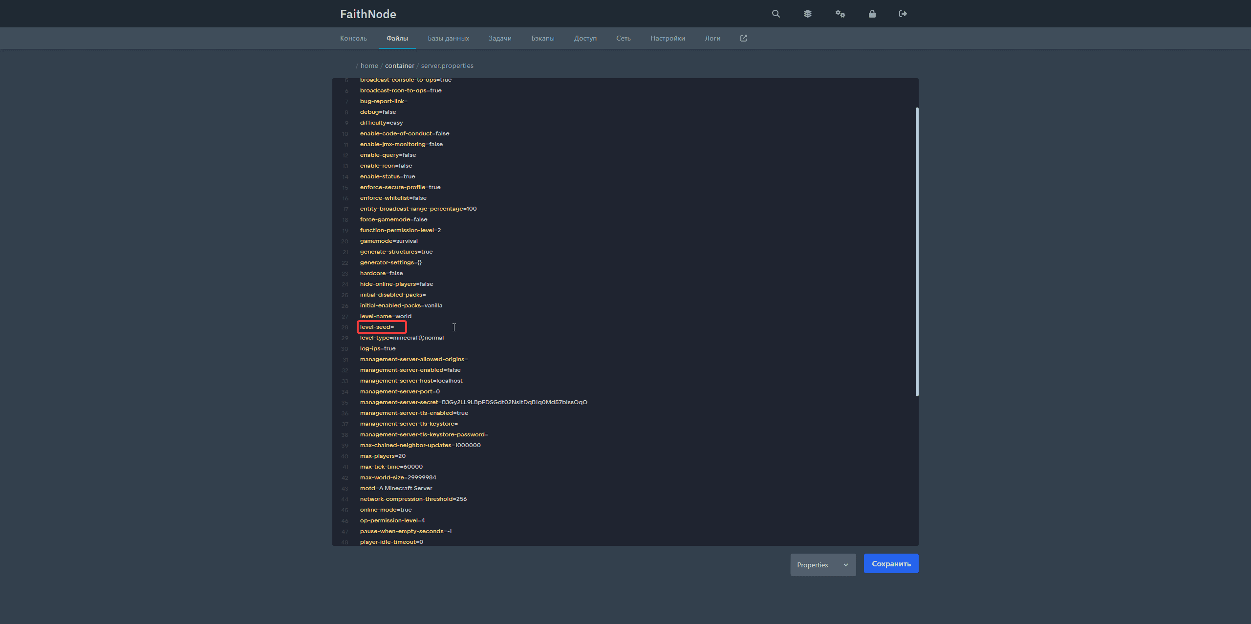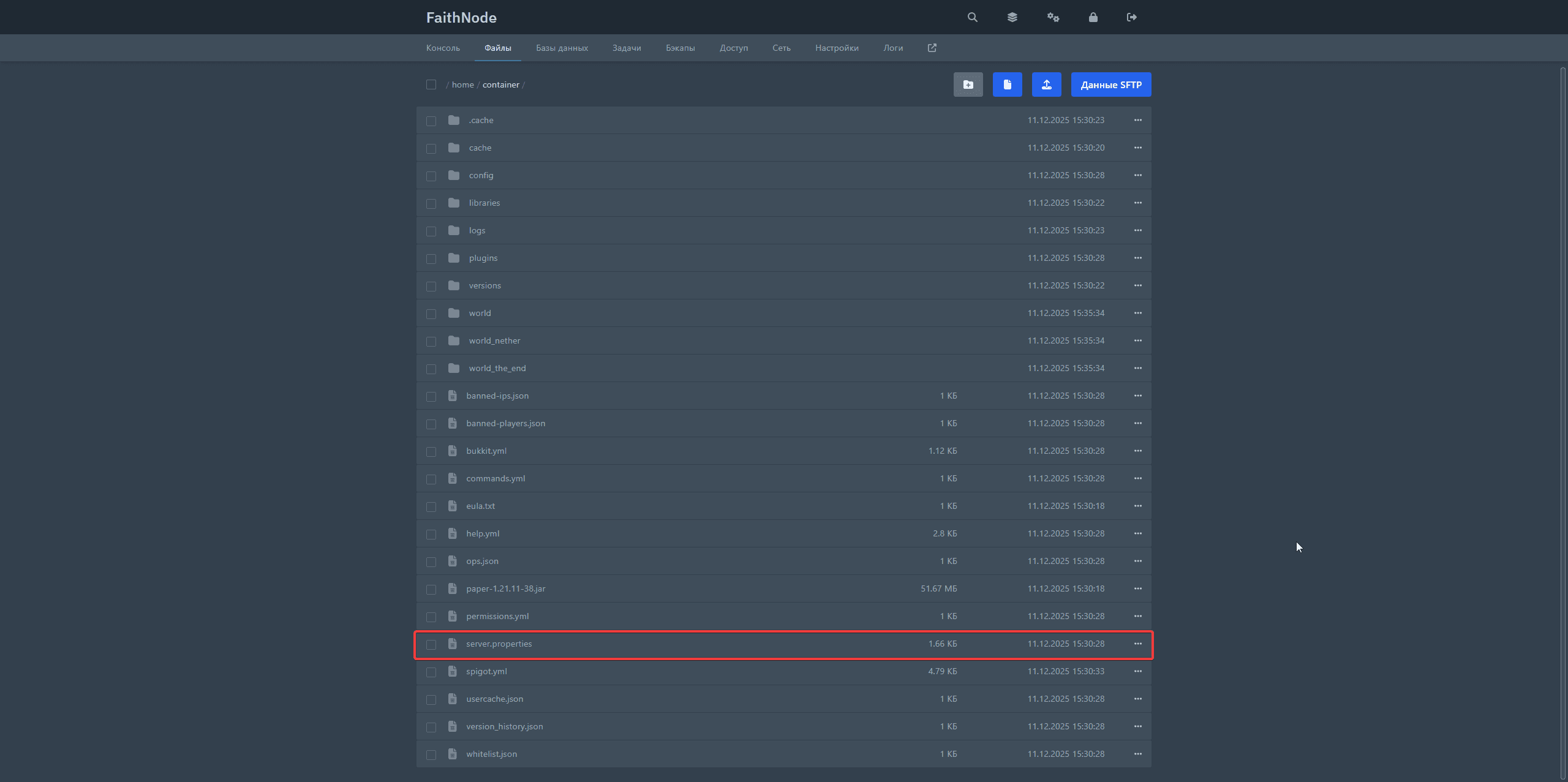 2. Откройте файл server.properties: